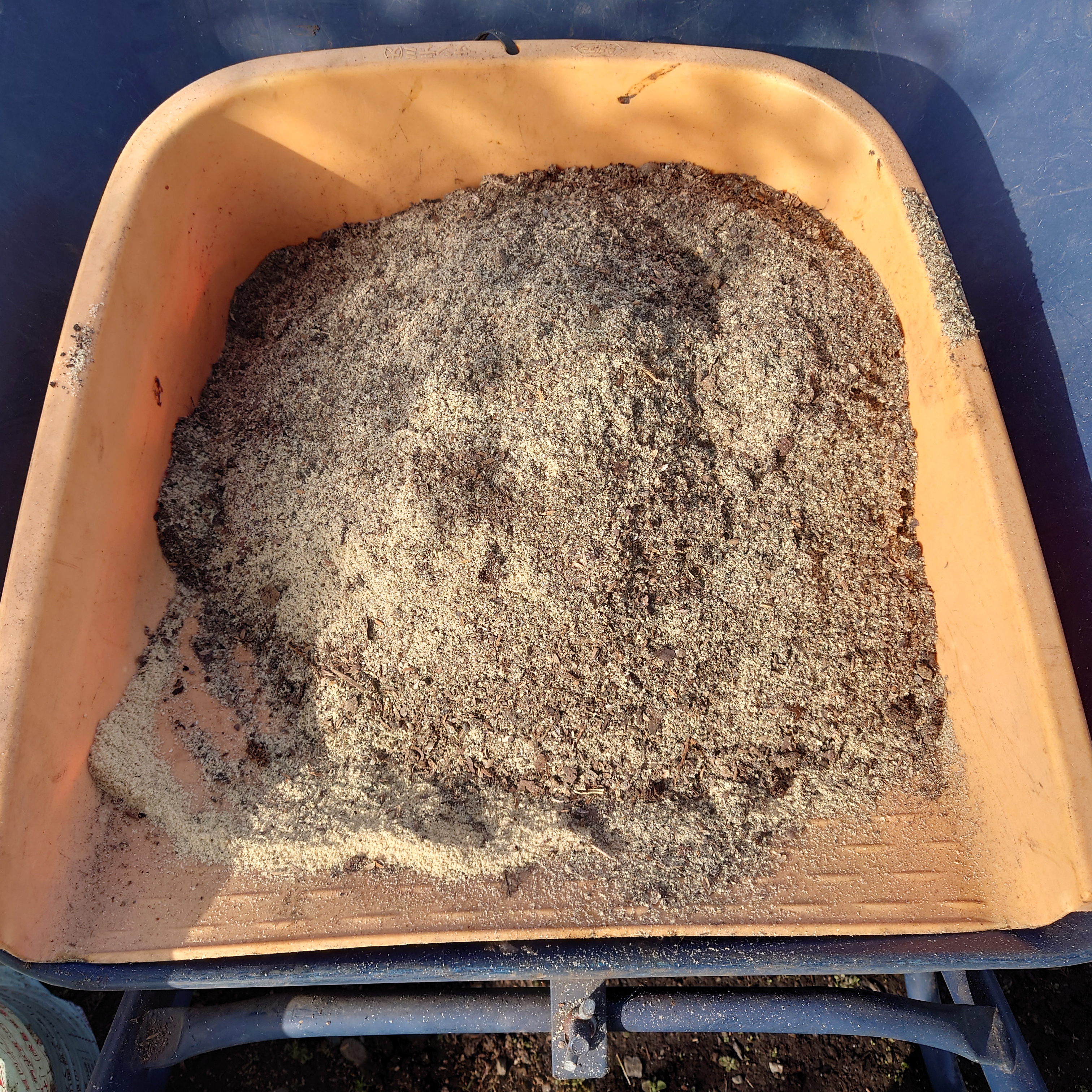 - 雑草堆肥・鶏糞堆肥(爽菜農園産)、米糠を混ぜたものを、畝上に撒く。