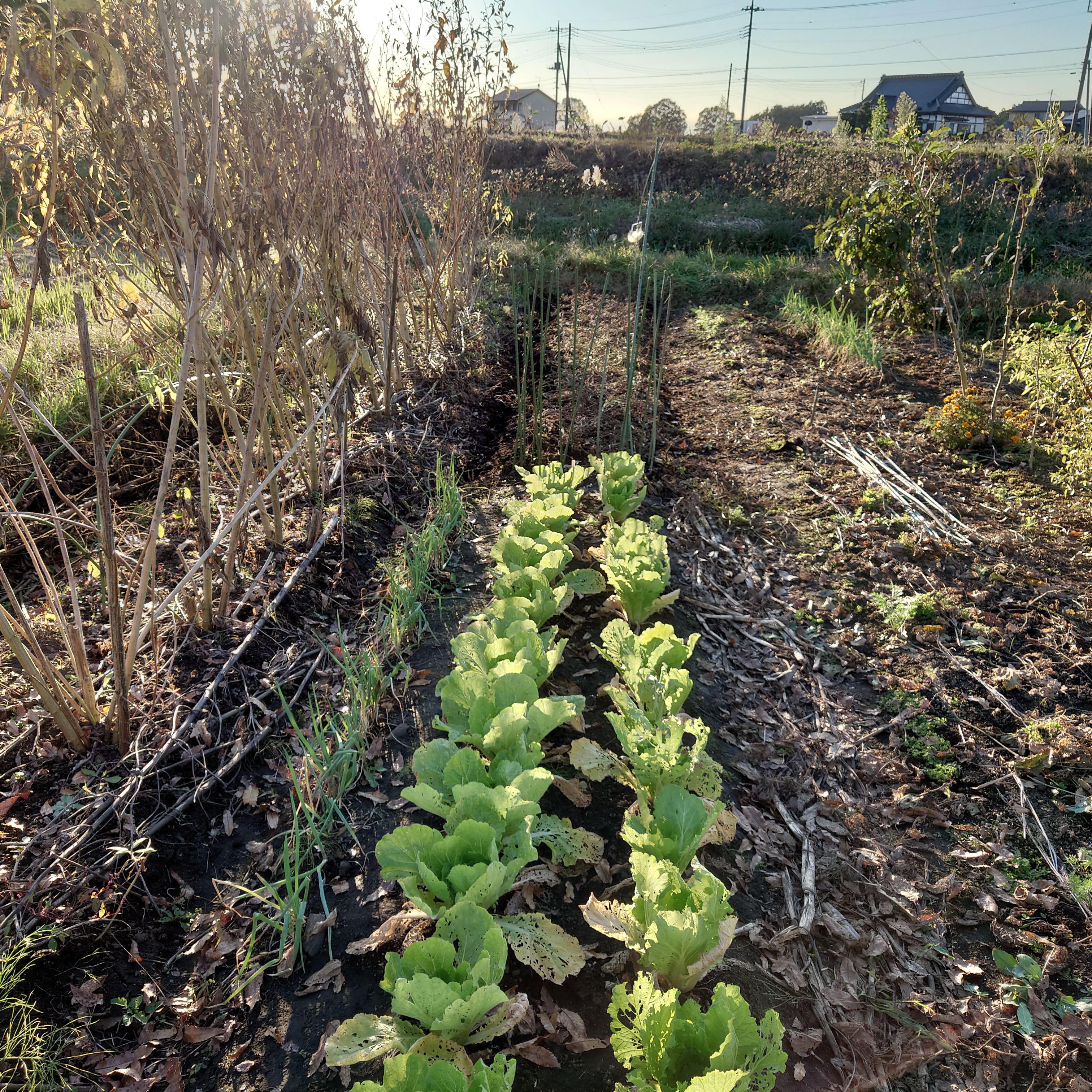 | 2 | 6.5 | 90~100 | 10 | 2 | 60 | 30 | 2~3(人差し指第一関節) | 雑草堆肥・鶏糞堆肥(爽菜農園産)、米糠 | 透明マルチ | - | #196 大豆が失敗したと判断し同じ畝に播種 |