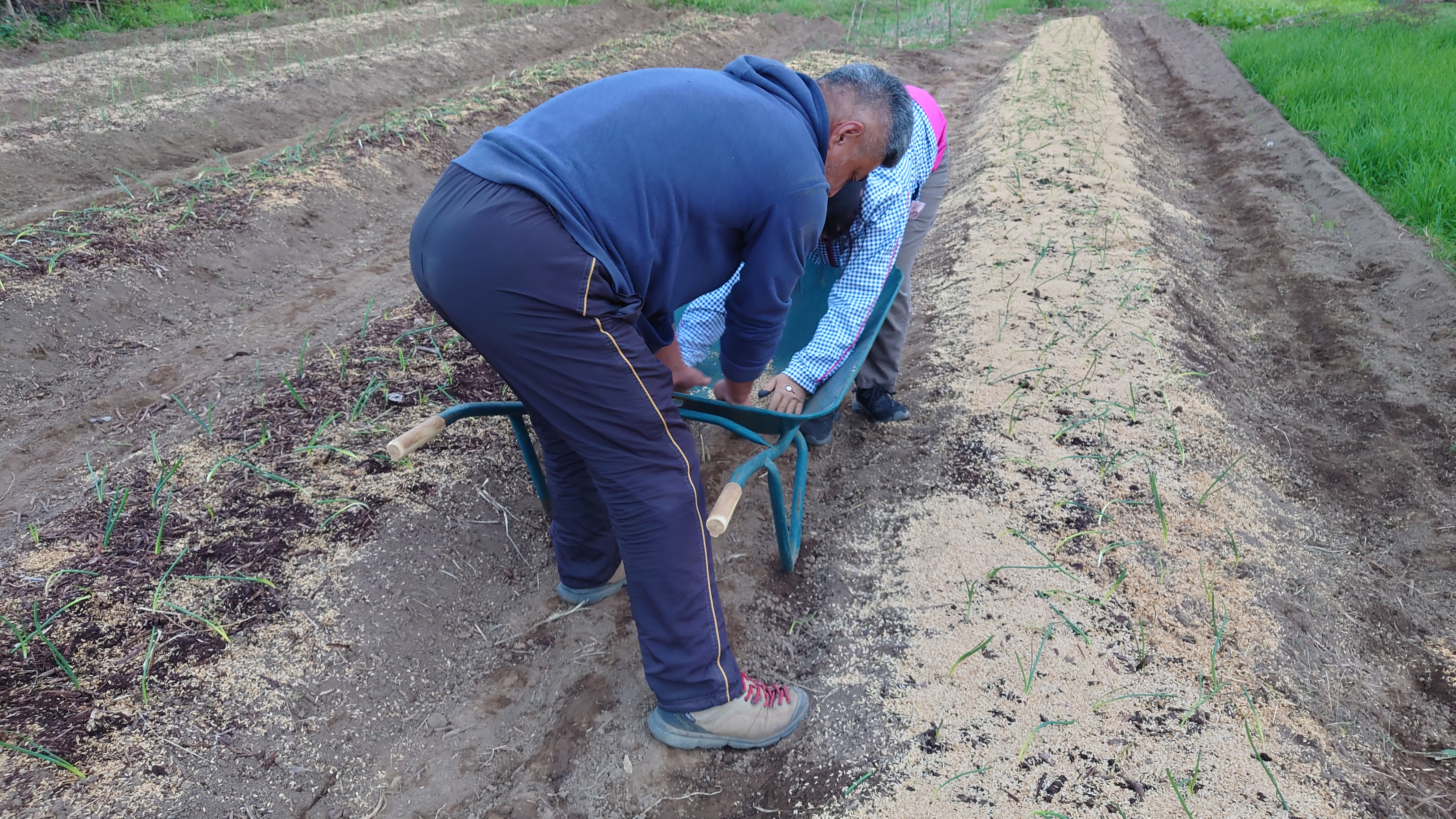 1. 草管理を行い除けた後、筋播きにし、ウッドチップ又は土を載せ足で軽く踏む。