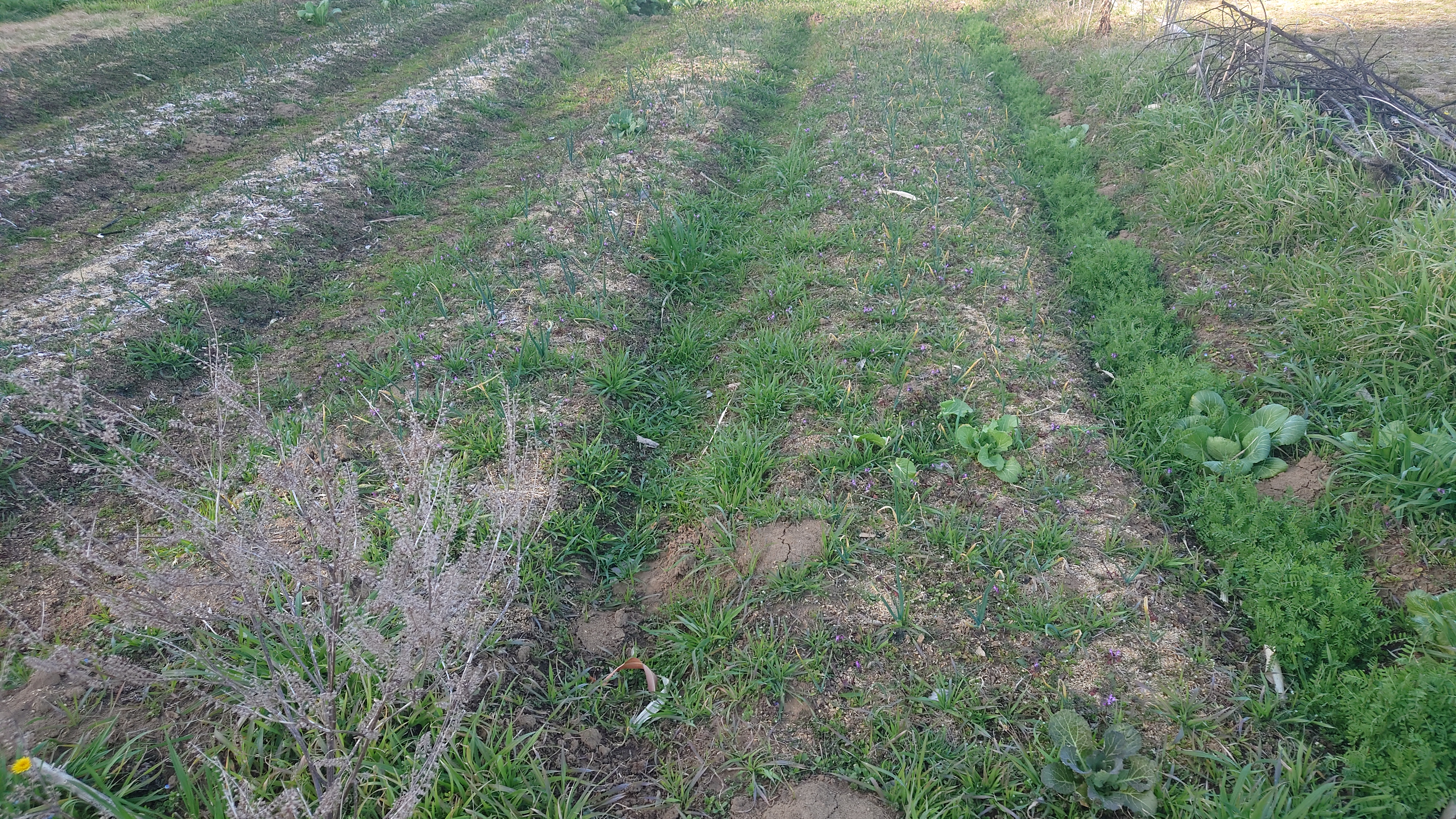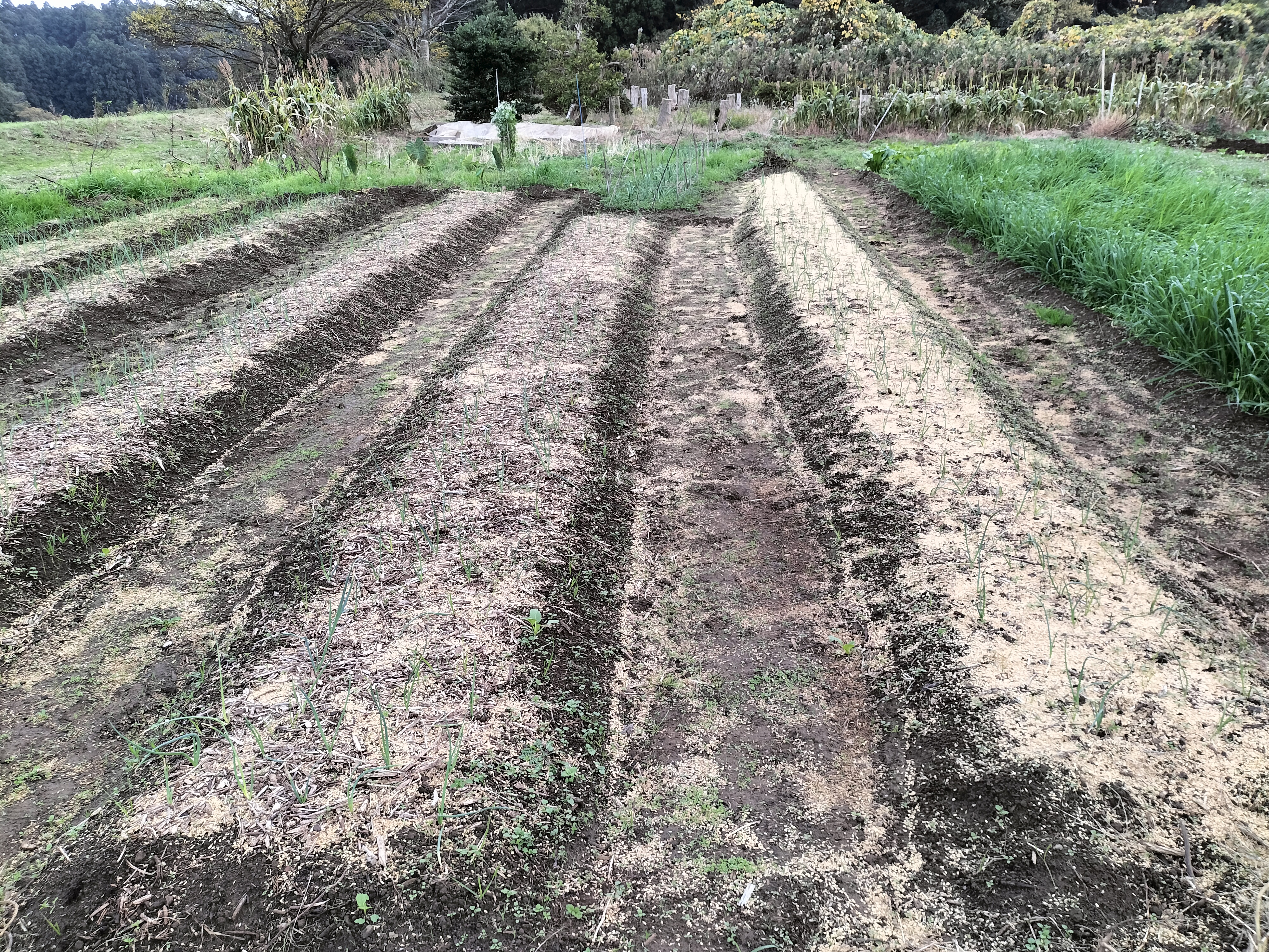 購入 5 90 10 5 15 15 白い部分が隠れる深さ 1 66苗/条 x 5条 x 5畝 合計1,320苗。畝間にヘアリーベッチ緑肥。予定では4畝だったが、機械で畝立てしたことから、計算が狂い5畝となりました。