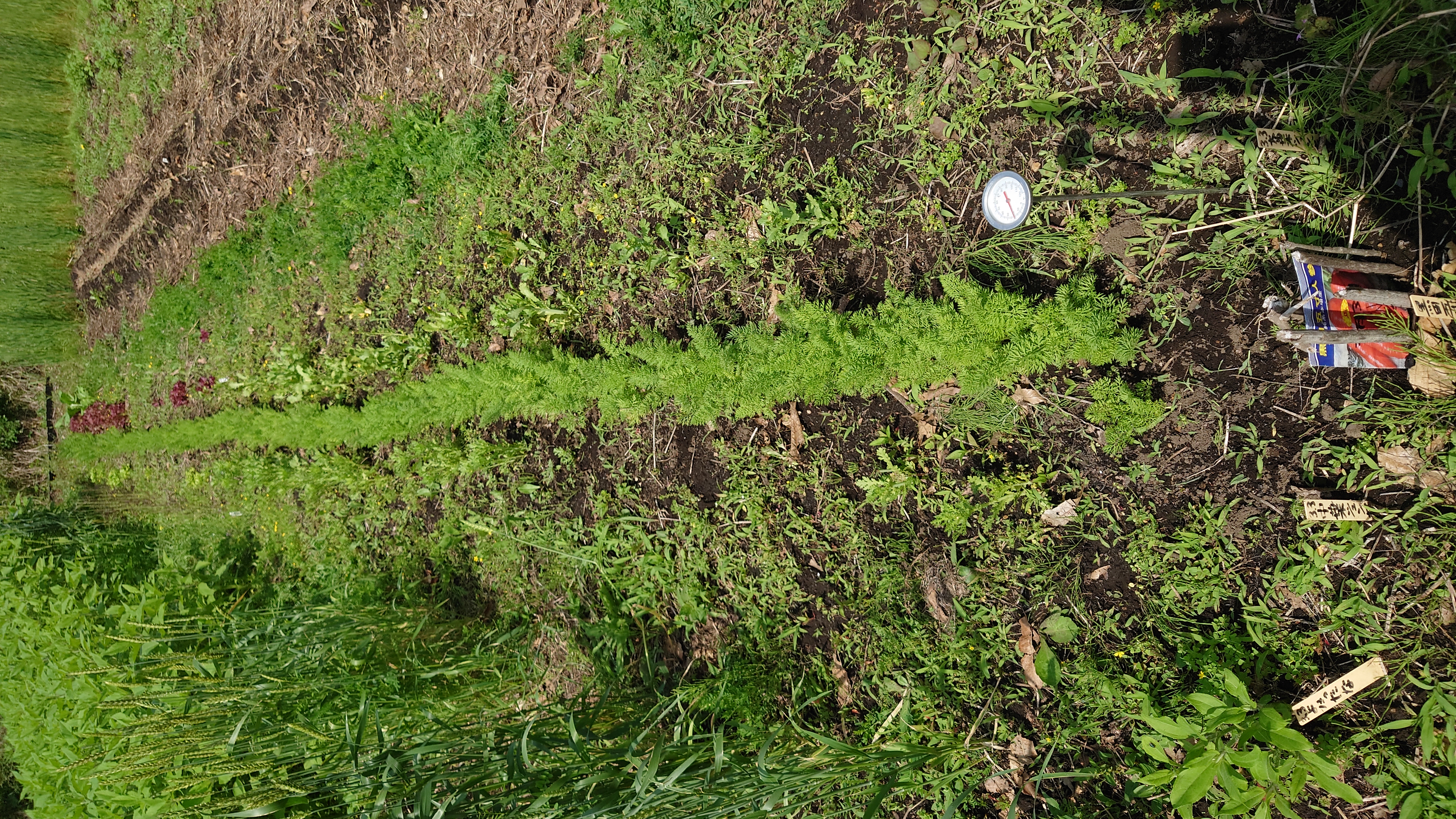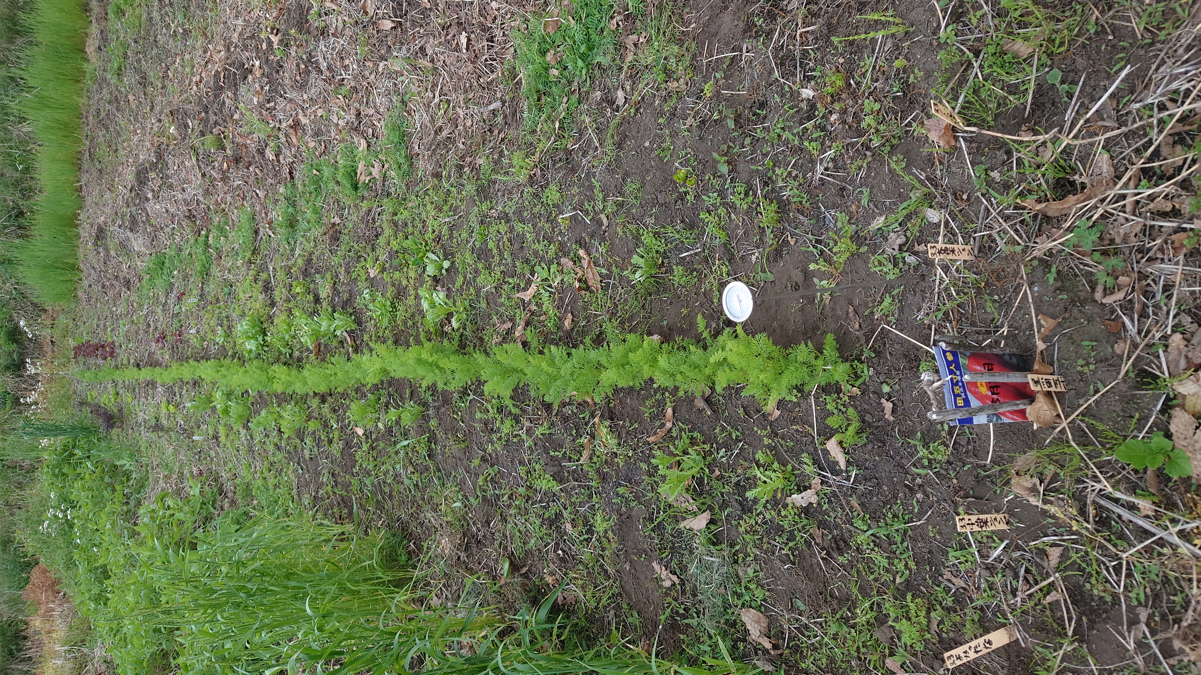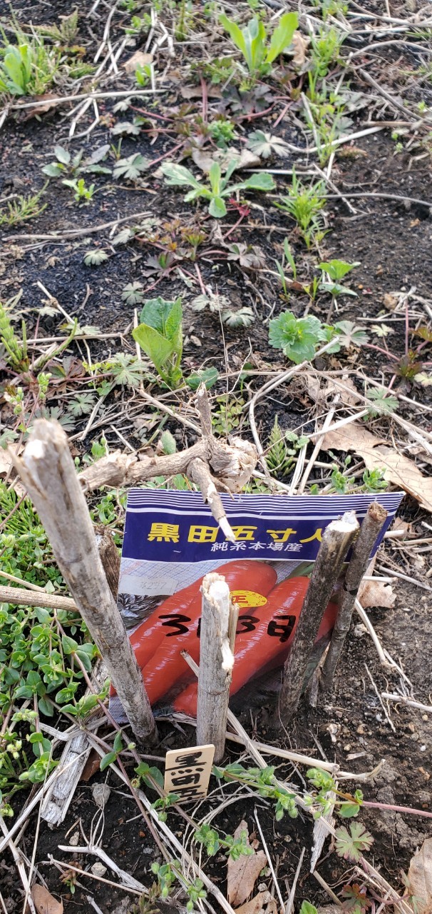 - 試験的に、そのニンジンの合間に、レンタル農園自家取りのニンジン種を播種してみました。