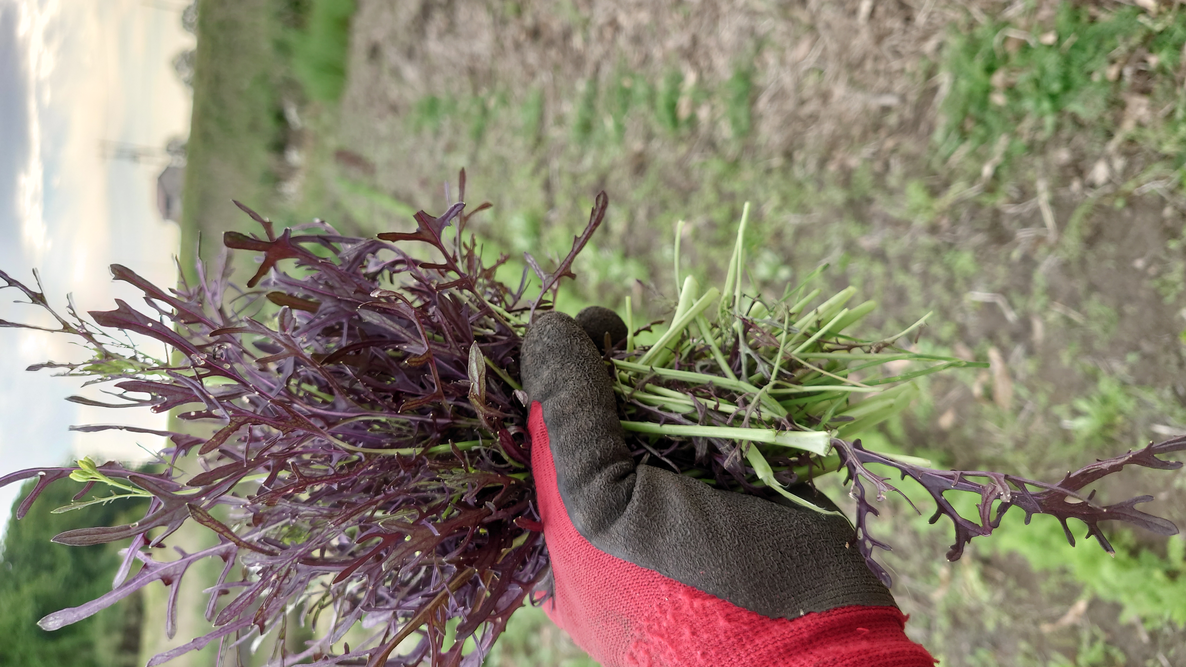 - カラシナ(コーラルリーフ フェザー)の董立ちが目立つものなどを切り取って収穫。