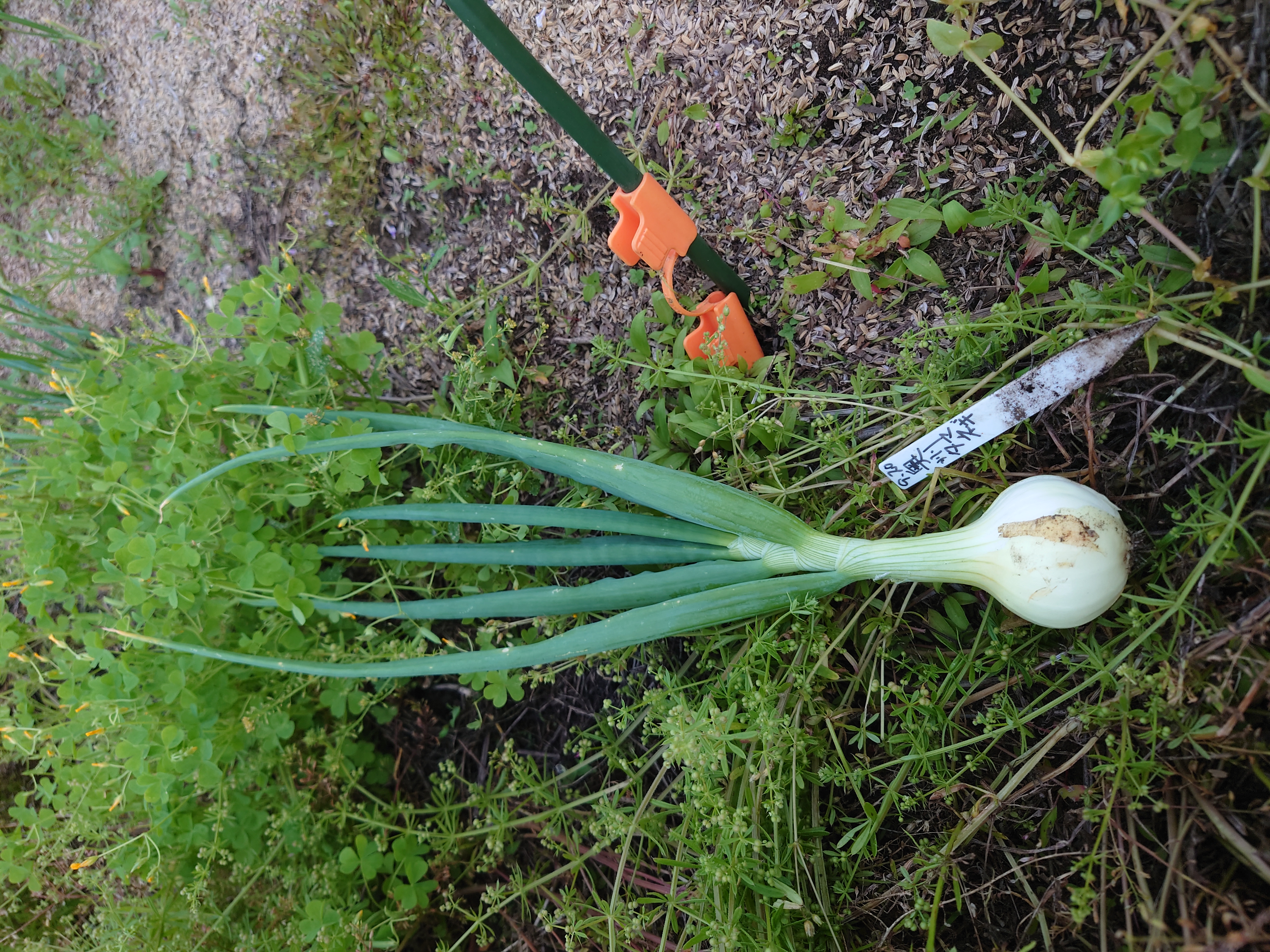 - 球が十分に太り、茎が7割程度倒れてきたら、立っている残りの茎も倒し、1週間程度放置します。